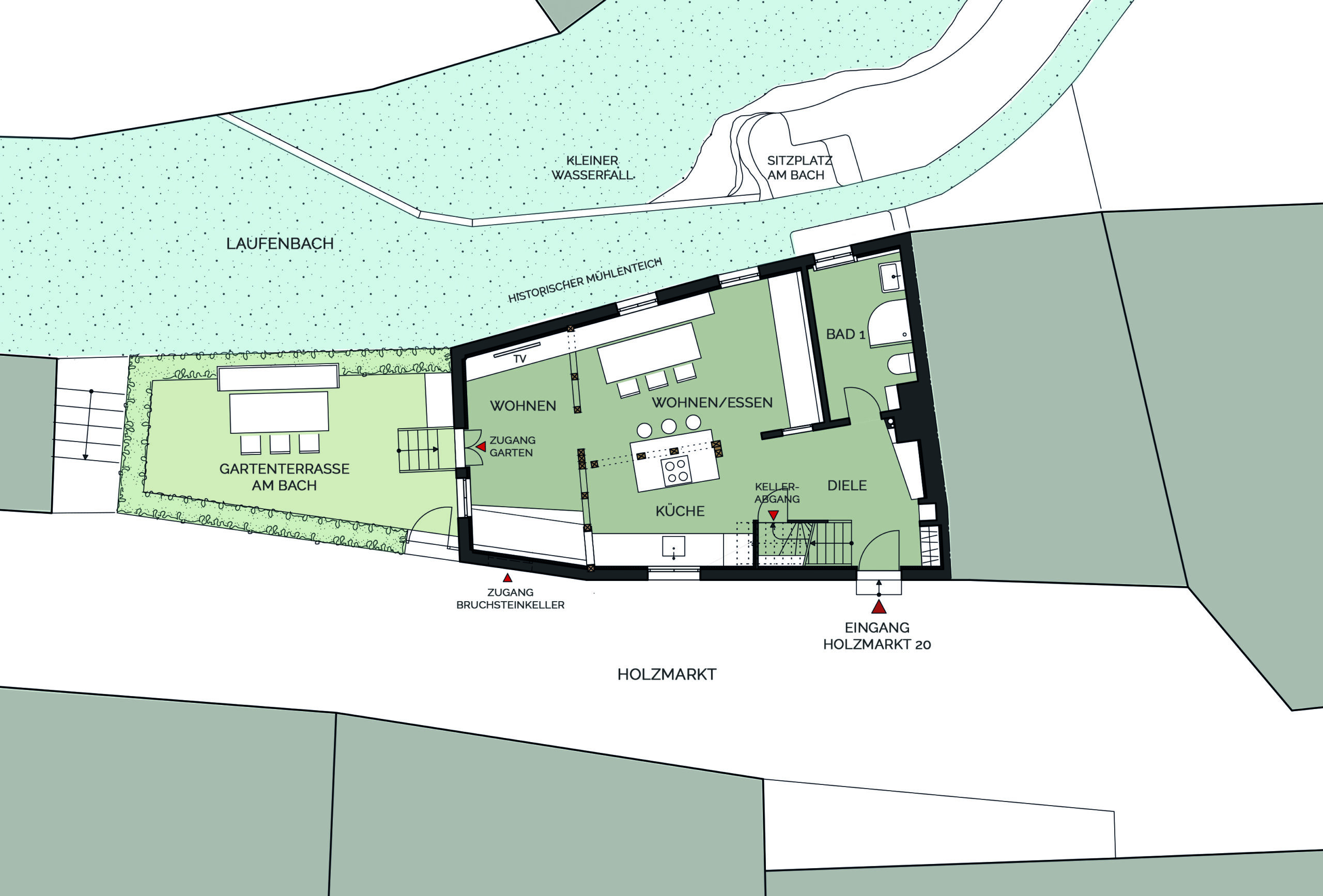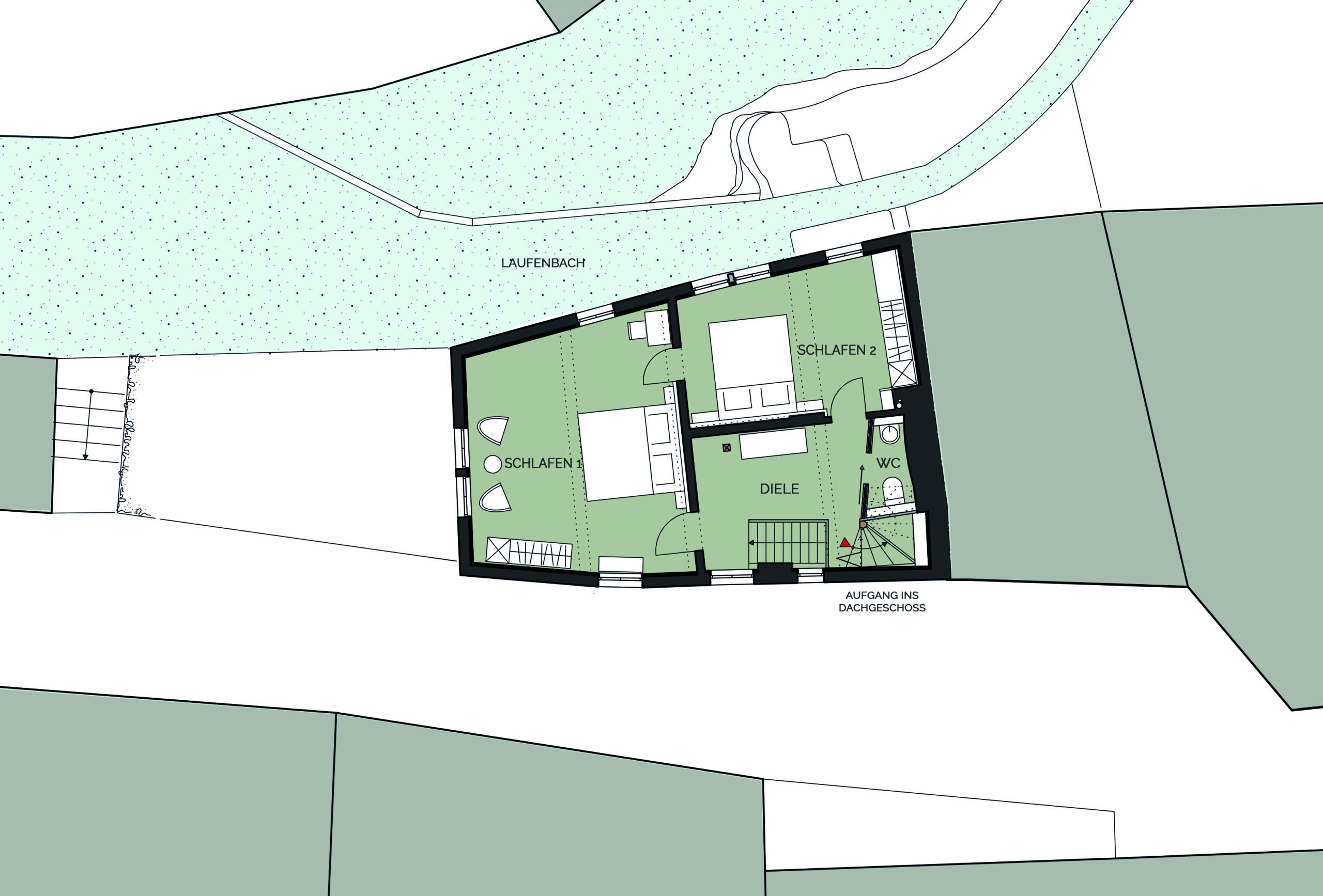 Auf der Eingangsebene befinden sich der Wohn- und Essbereich mit offener, voll ausgestatteter Küche und Kochinsel, gemütlichen Sitz- und Liegeflächen sowie ein direkter Zugang zur Gartenterrasse am Bach. Darüber hinaus gibt es ein Duschbad/WC.
