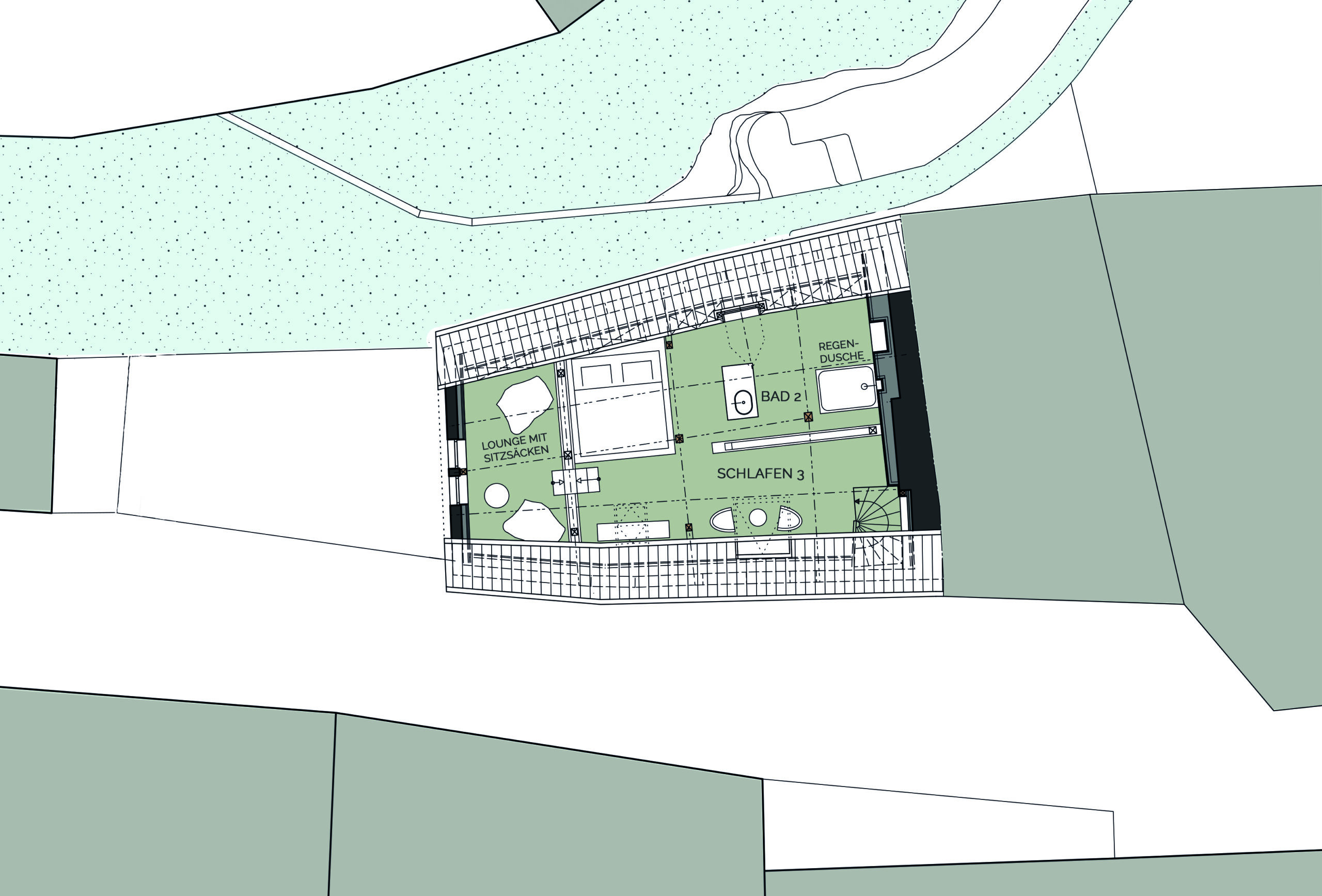 Über eine historische Wendeltreppe gelangt man in die offen gestaltete Wohn- und Schlafebene unter dem Dach. Hier befindet sich ein weiterer Schlafbereich für zwei Personen mit offenem Bad und Regendusche sowie einem Relax-Podest mit übergroßen Sitzsäcken der Marke Fatboy.